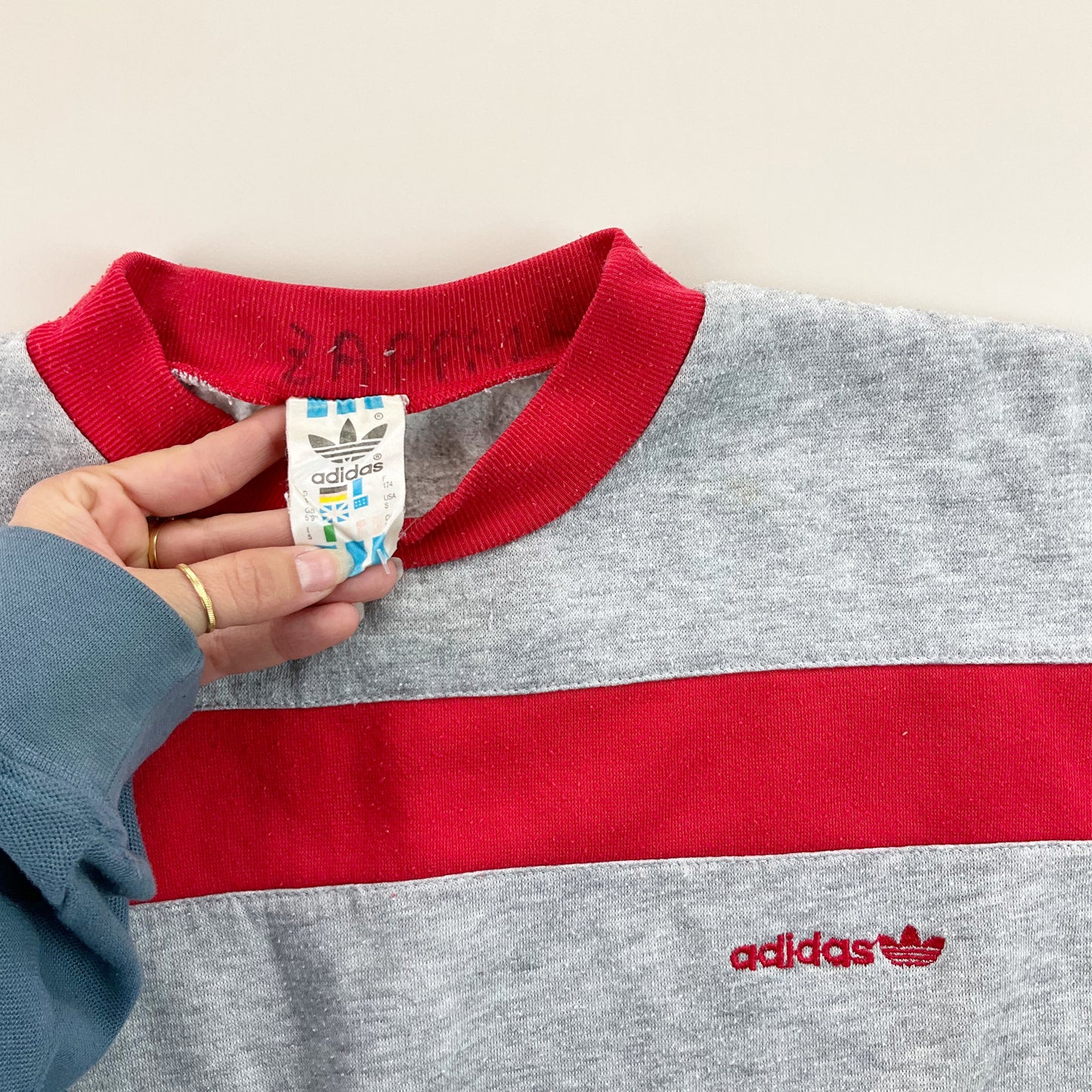 Infos: Logos auf Sweatshirt und Hose gestickt. rote und graue Farbe.