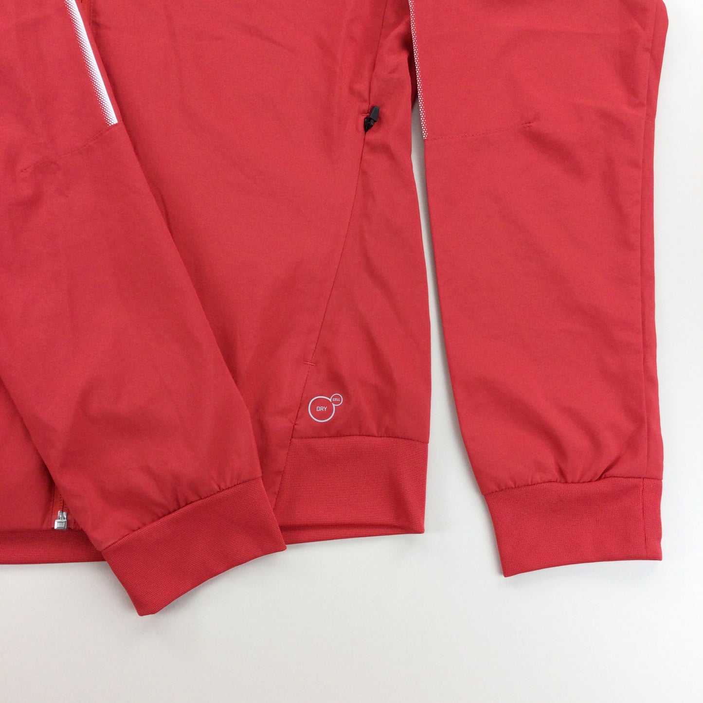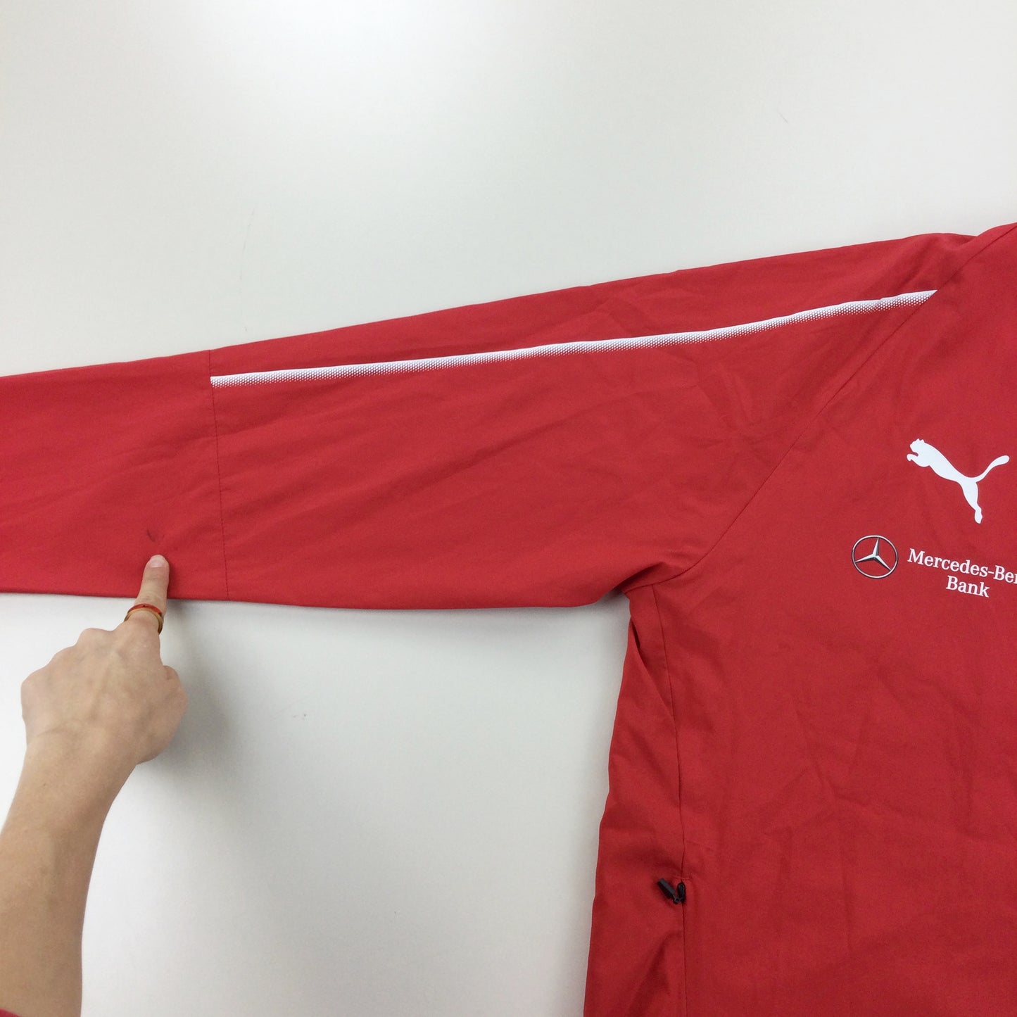 Infos: rote Farbe. Logo auf der Vorderseite und am Ärmel gedruckt. Marken auf der Rückseite.