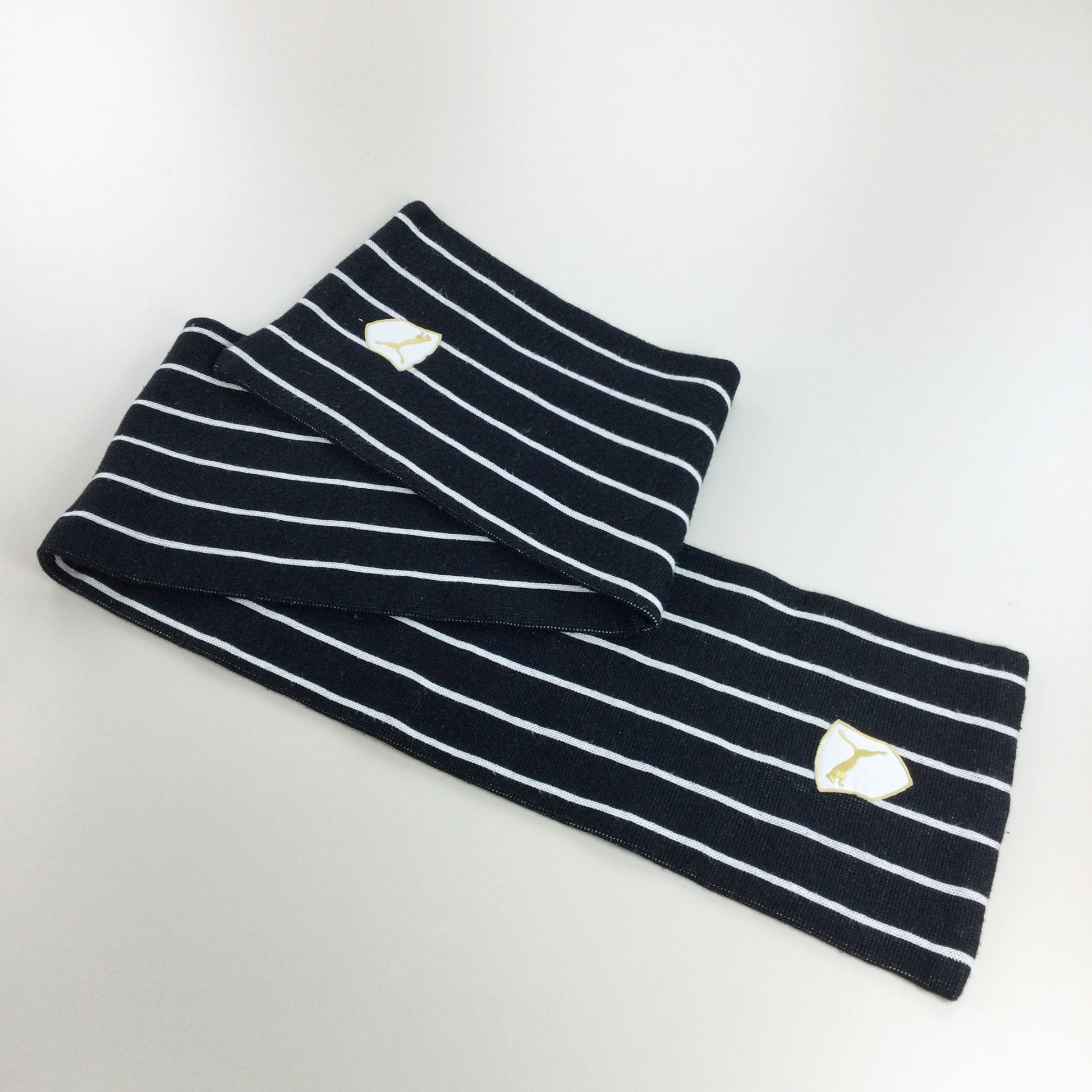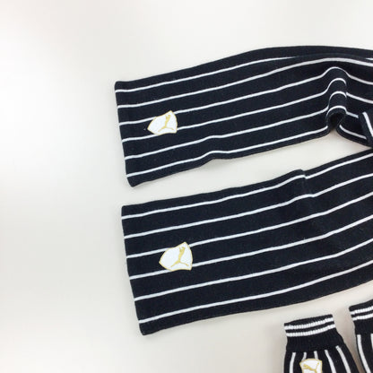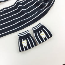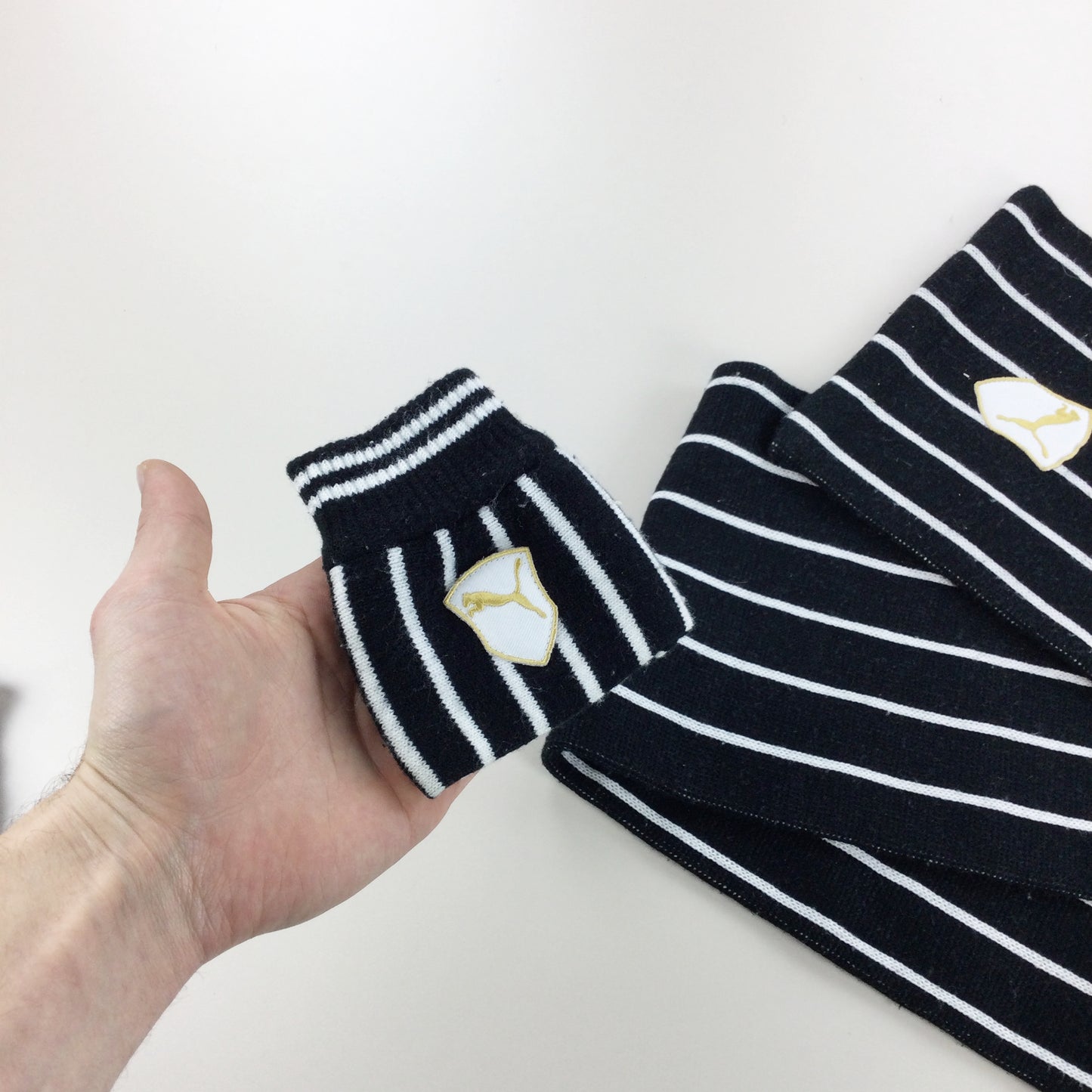 Infos: schwarz/weiß gestreift. Logos gestickt. Schal und Handschuhe.